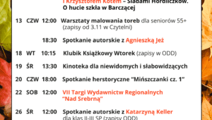 04.10 (sobota), 10:00 Weekend seniora z kulturą – warsztaty malowania na szkle (zapisy w Czytelni), wystawa “Niekonwencjonalne piękno” 08.10 (środa), 11:00 “Zawodowiec w Oddziale” – spotkanie z przeds...