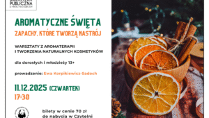 Zapraszamy 11 grudnia (czwartek) o godzinie 17:30 na warsztaty z aromaterapii i tworzenia naturalnych kosmetyków, które poprowadzi Ewa Korpikiewicz-Sadoch. Zajęcia dla osób dorosłych i młodzieży 13+....