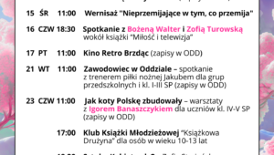 KWIECIEŃ 2026 8.04 (środa), 13:00 Kinoteka z audiodeskrypcją 10.04 (piątek) 16:00 Jak przygotować się do matury ustnej – zajęcia z Natalią Kołodziejek (zapisy w Czytelni) 13.04 (poniedziałek) 10:30 Ko...