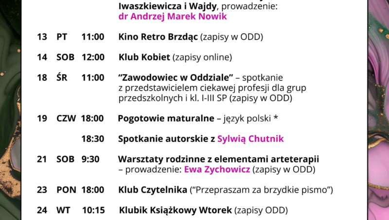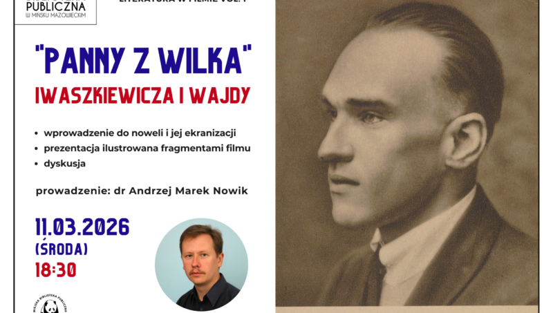 JAK CIĘ WIDZĘ – WARSZTATY PLASTYCZNE Z ELEMENTAMI ARTETERAPII dla dziecka z rodzicem 21 marca 2026, sobota godz. 10:00-12:00 Miejska Biblioteka Publiczna w Mińsku Mazowieckim, ul. Piłsudskiego 1a prowadzenie: Ewa Zychowicz – Pracownia DO GÓRY NOGAMI Podczas warsztatów stworzymy jeden wspólny obraz z dwóch perspektyw – malując portrety siebie nawzajem po dwóch stronach okna. Zapisy […]