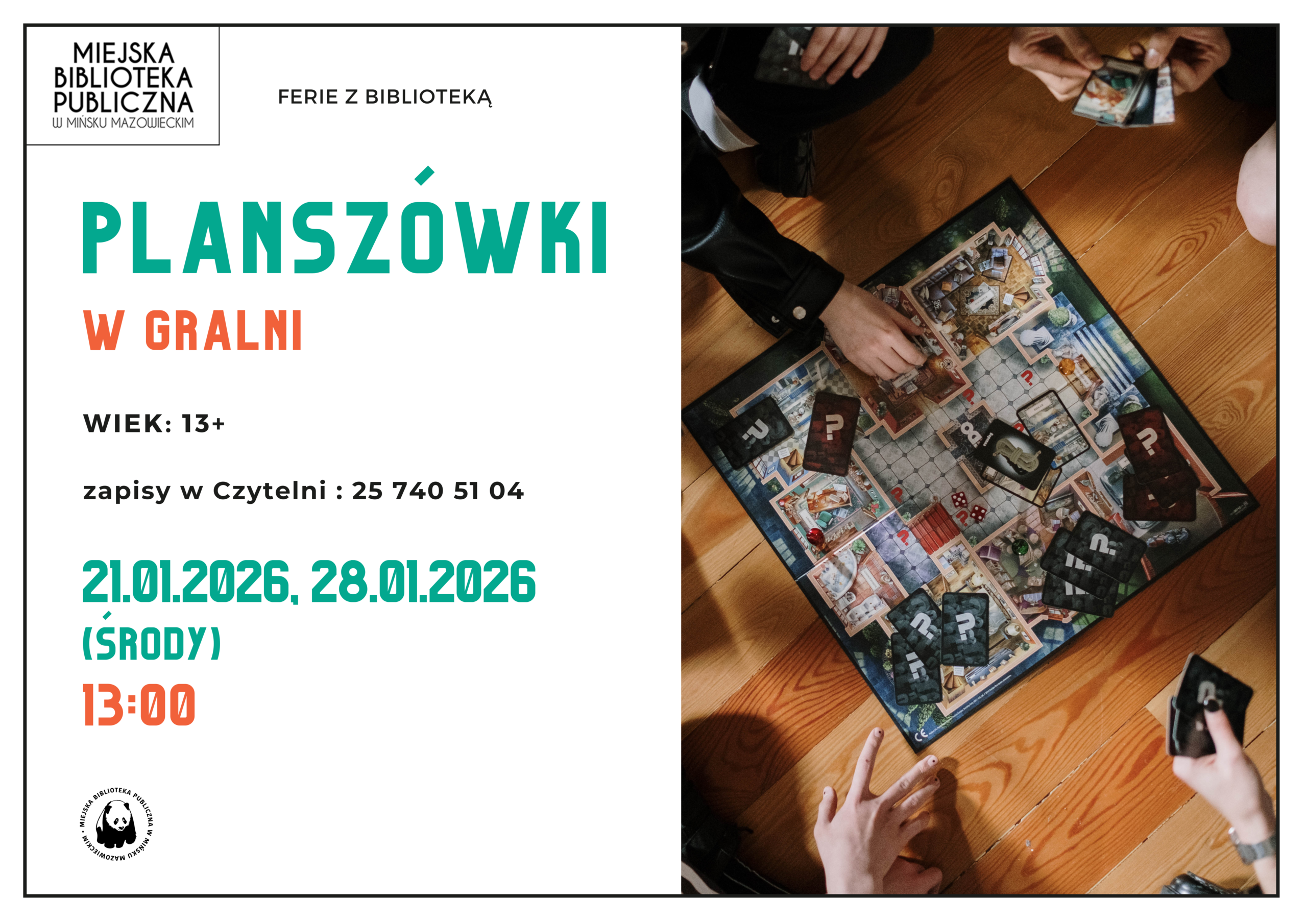 Planszówki w Gralni Dla młodzieży 13+, zapisy w Czytelni 00 dni 00 godzin 00 minut 00 sekund Data 21 stycznia, 2026 Czas 13:00 Kategoria dla młodzieży