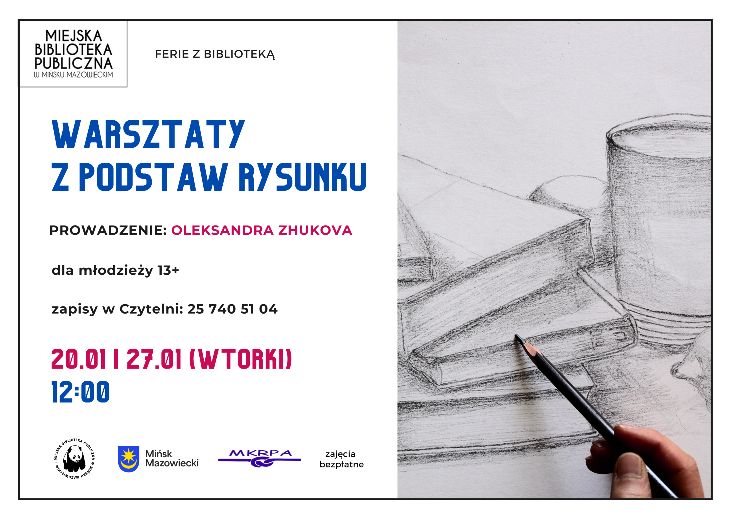 Podstawy rysunku Dla młodzieży 13+, zapisy w Czytelni. 00 dni 00 godzin 00 minut 00 sekund Data 27 stycznia, 2026 Czas 12:00 Kategoria dla młodzieży