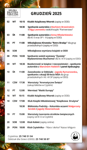 Kalendarz wydarzeń na grudzień 28 listopada 2025 Aktualności GRUDZIEŃ 2025 02.12, 10:15 Klubik Książkowy Wtorek (zapisy w ODD) 02.12, 18:30 Spotkanie autorskie z Markiem Brzezinskim i Olgą Leonowicz wokół książki “Partnerstwo” 03.12, 11:00 Spotkanie autorskie z Anną Włodarkiewicz dla kl. 0 oraz SP I – II (zapisy w ODD) 05.12, 11:00 Mikołajkowa Kinoteka “Retro Brzdąc” dla grup przedszkolnych (zapisy w ODD) 06.12 Mikołajkowa wymiana książek w ODD 08.12, 10:00 Spotkanie wokół wystawy “Żywioły” Wydawnictwa Muchomor dla kl. III-IV (zapisy w ODD) 09.12, 18:30 Bezdomność w książce i rzeczywistości – spotkanie autorskie z Marcinem Halskim i panel dyskusyjny 10.12, 11:00 Zawodowiec w Oddziale – Jagoda Rymanowska, spotkanie z okazji 50-lecia MSA dla grup przedszkolnych i kl. I-III SP (zapisy w ODD) 11.12, 17:30 Warsztaty “Aromatyczne Święta” (zakup biletów w Czytelni) 12.12, 12:00 Wernisaż “Matki Europy” 16.12, 10:15 Klubik Książkowy Wtorek (zapisy w ODD) 18.12, 17:00 Klub Książki Młodzieżowej “Książkowa Drużyna” 18.12, 18:30 Kolumbia bez tajemnic – Biblioteka Podróży – Małgorzata Sendek i Jagoda Wawrzeńczak 19.12, 15:00 Warsztaty tworzenia stroików świątecznych (zapisy od 8.12 w Czytelni) 20.12, 12:00 Klub Kobiet (zapisy online) 29.12, 18:00 Klub Czytelnika – „Klara i słońce” Kazuo Ishiguro Czytelnia: 25 740 51 04 Oddział dla Dzieci (ODD): 25 740 50 87 28 listopada 2025