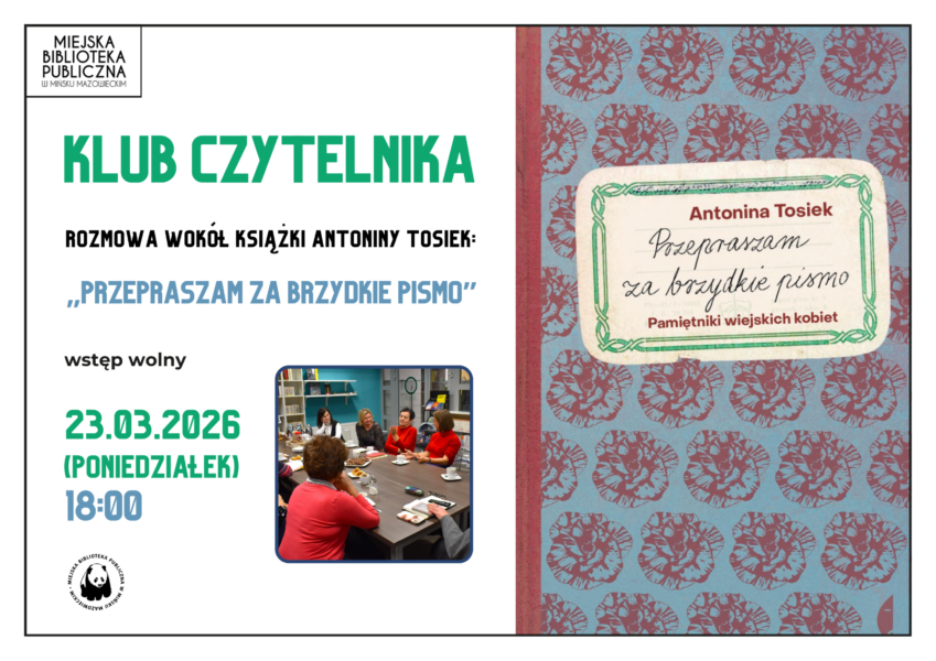 Klub Czytelnika 11 marca 2026 Aktualności Serdecznie zapraszamy na Klub Czytelnika 23 marca (poniedziałek) o godzinie 18:00. Tym razem rozmowa toczyć się będzie wokół książki „Przepraszam za brzydkie pismo” Antoniny Tosiek. 11 marca 2026