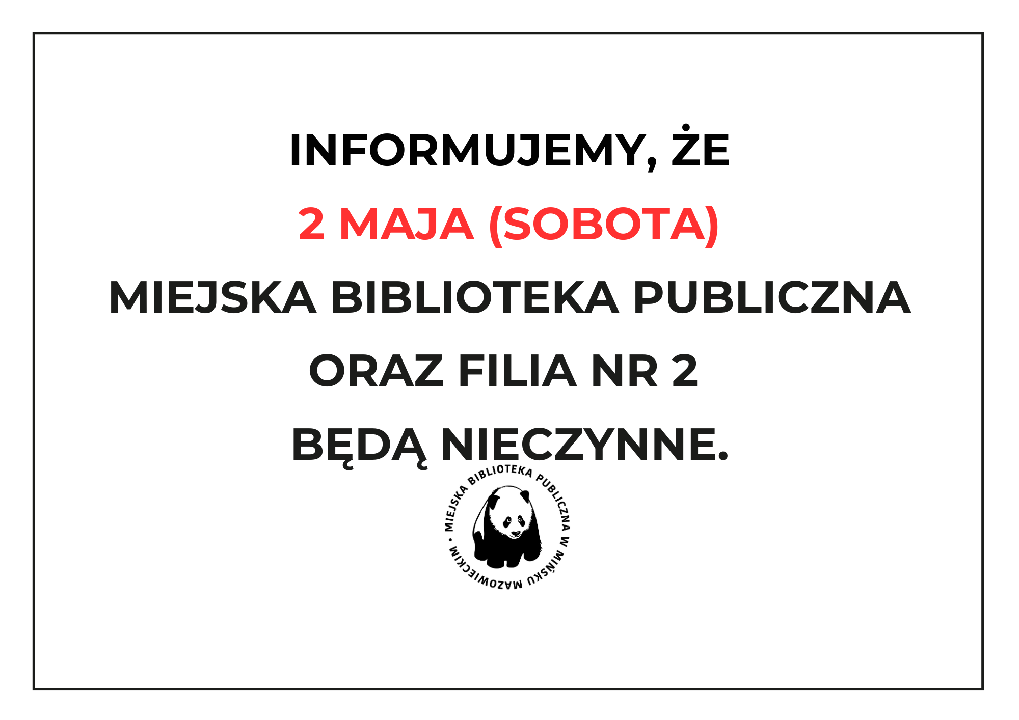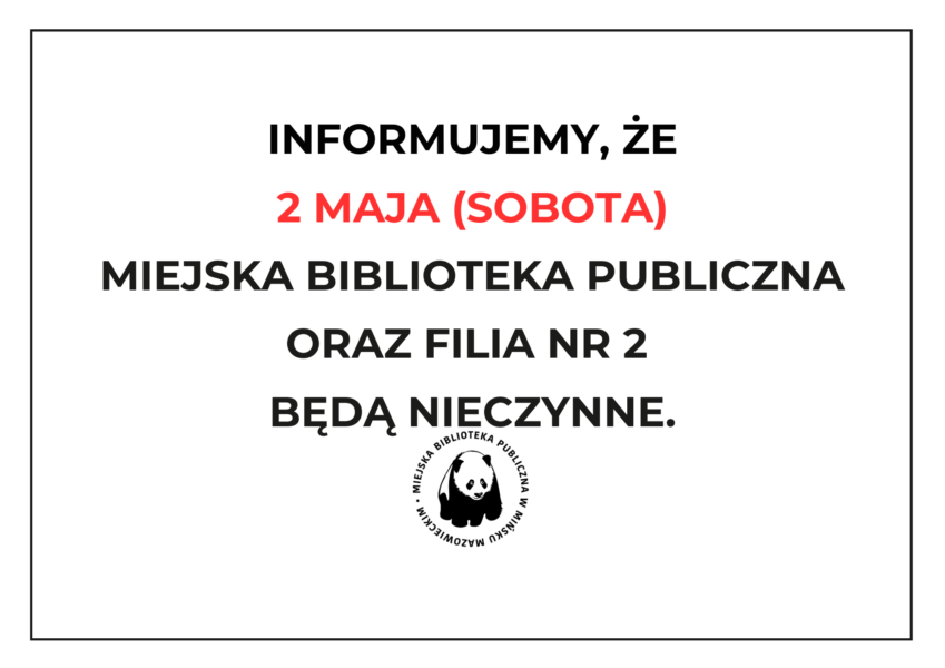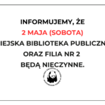UWAGA! Biblioteka oraz Filia nr 2 nieczynne 28 kwietnia 2026 Aktualności Informujemy, że 2 maja (sobota) biblioteka główna oraz Filia nr 2 będą nieczynne. 28 kwietnia 2026
